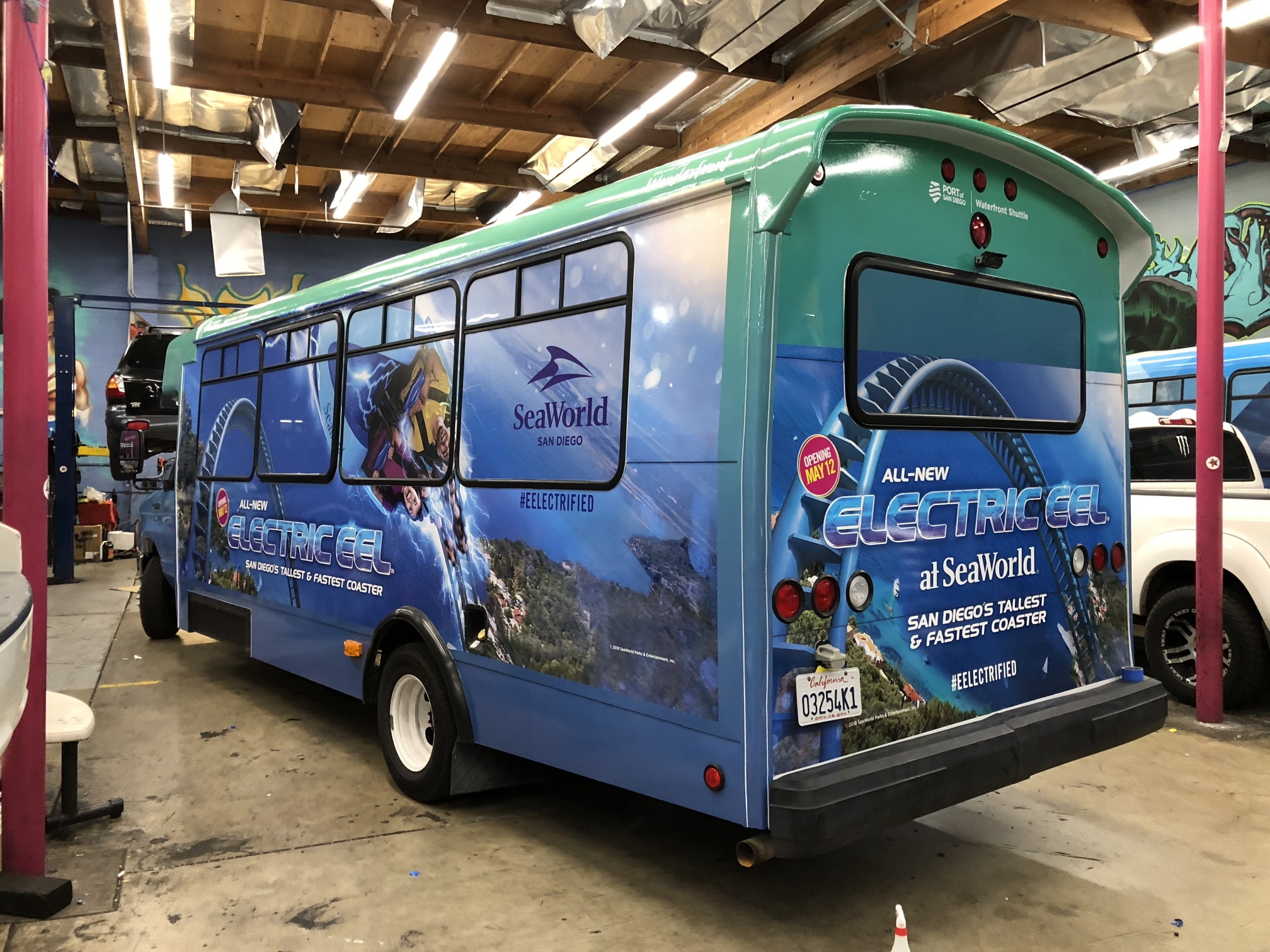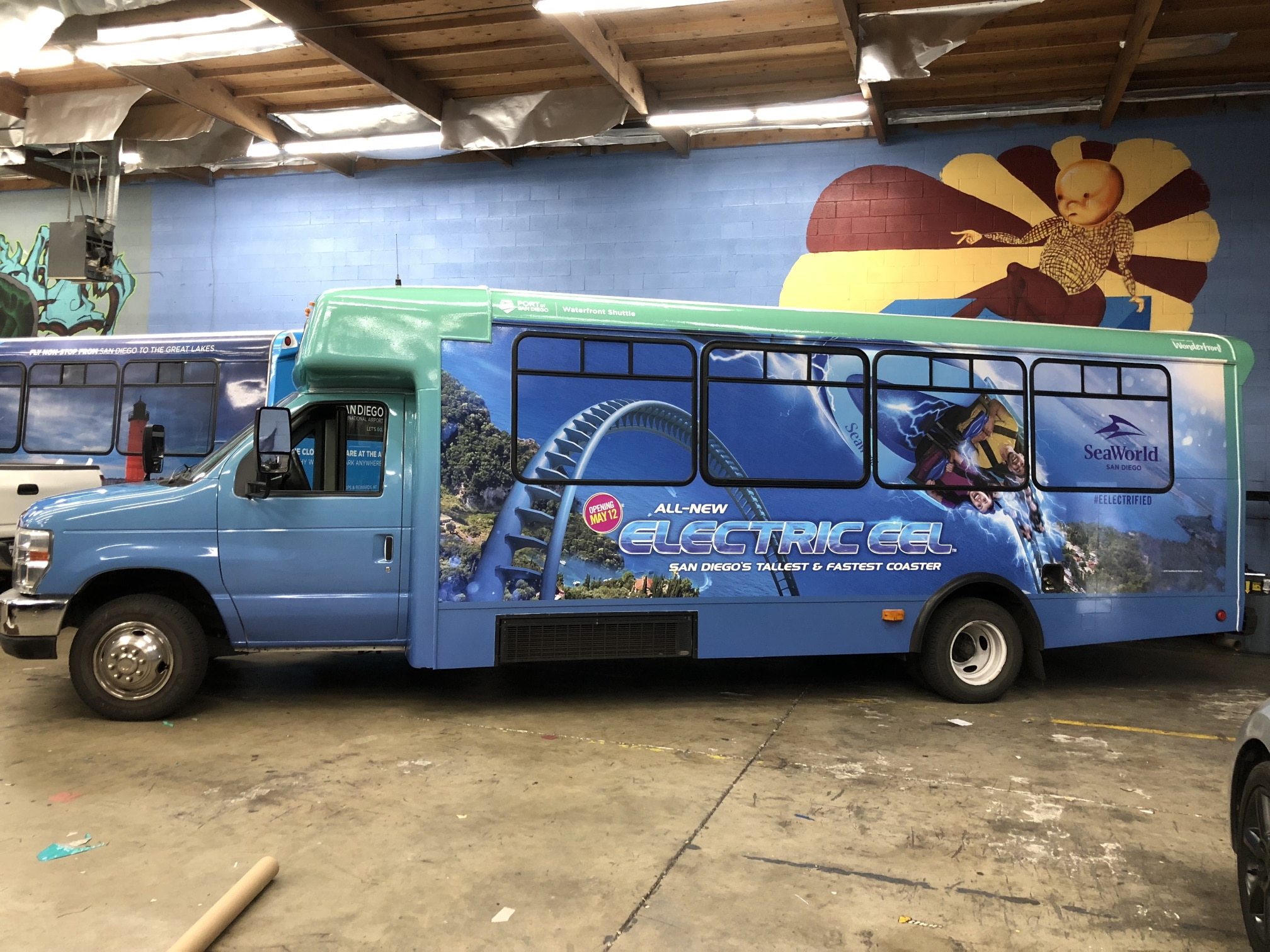 Port of San Diego was looking for ways to generate advertising revenue through the existing channels of their company. One of the best ways was to wrap buses that drive all over San Diego as free advertisement and utilizing the available space as paid advertising. By framing the sold advertising, with subtle company branding, we were able to seam together the 2 project goals into one amazing looking. We facilitated the entire process from start to finish. This included measurements, templates, printing, and installing. These go into circulation for 15 weeks and then they are returned to their original conditions!
